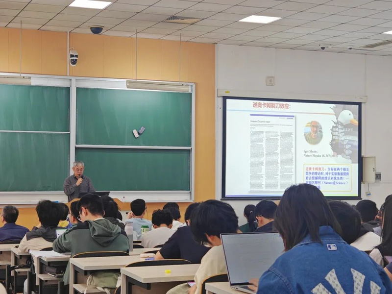 El 23 de marzo por la tarde, el profesor Sun Changpu, académico de la Academia China de Ciencias y de la Academia de Ciencias para el Mundo en Desarrollo, fue invitado a la serie de conferencias “Física hoy” de la Escuela de Ciencias Físicas y pronunció una ponencia monográfica titulado “Del aprendizaje creativo a la investigación científica. El académico Sun Changpu hizo hincapié en la importancia de cultivar la capacidad de “encontrar problemas” y “resolverlos, compartió su experiencia de aprendizaje creativo y analizó en profundidad el tema de “Innovación de conocimientos y la zona gris académica.